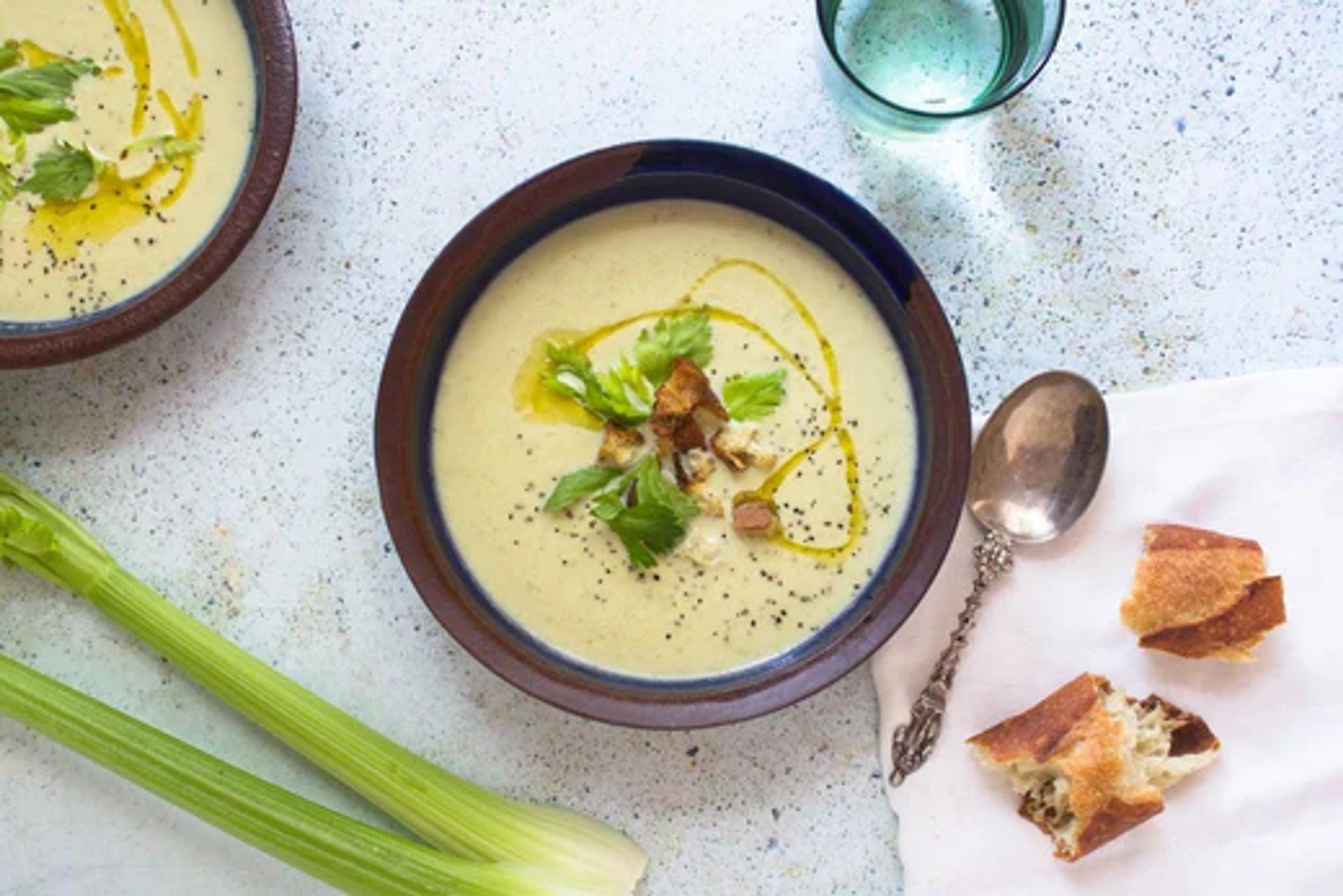 Remove soup from heat and let cool slightly; transfer to blender and pulse until smooth. Return soup to pot and bring to low simmer; stir in heavy cream or coconut cream and season with sea salt and pepper, to taste. Garnish with celery leaves, drizzle with oil, and serve.