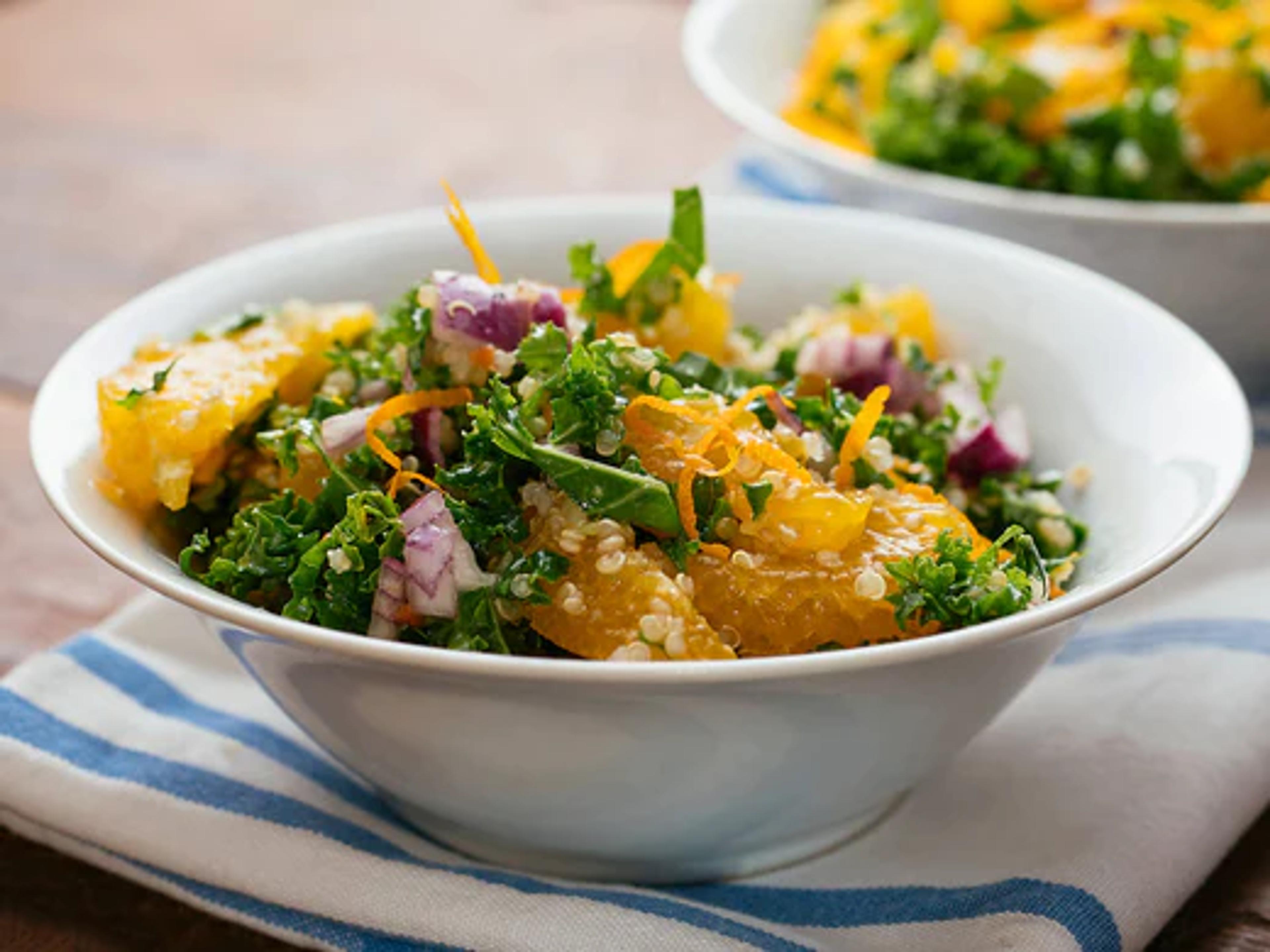 Remove stems from kale and thinly chop leaves. (Save ribs to use when making bone broth or smoothies.) In large bowl, add chopped kale, citrus segments, grated carrot, and quinoa. Mix to combine.