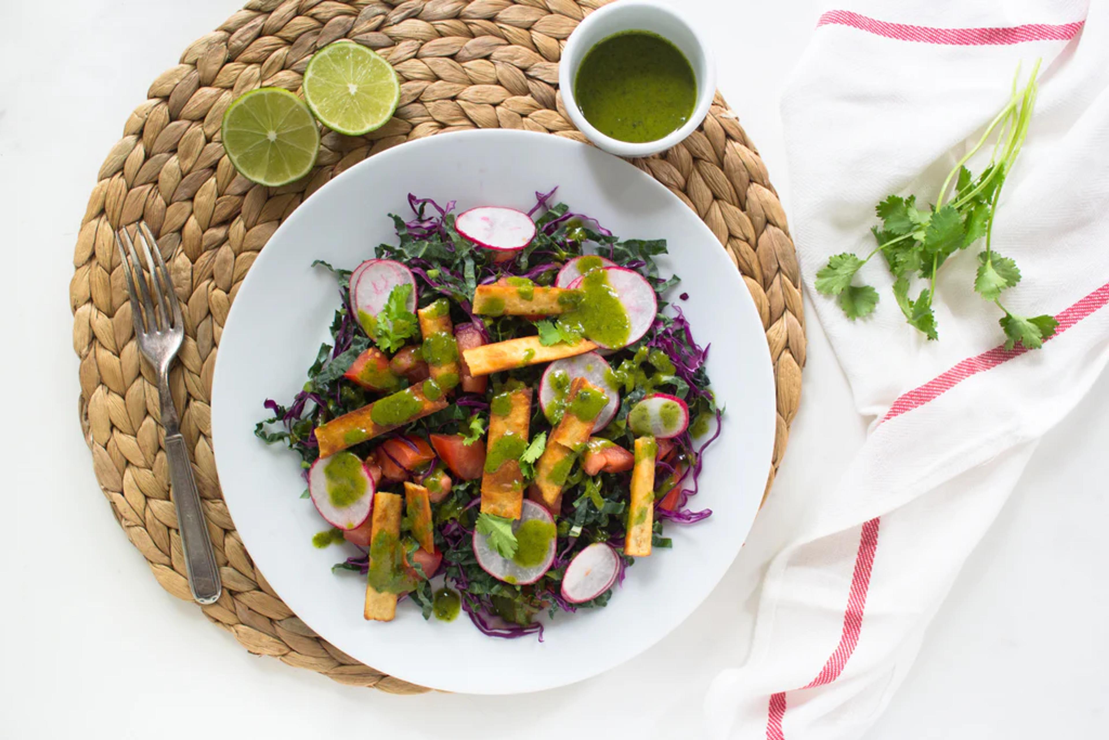 Combine cilantro, lime juice, 1 tsp. salt and 3 Tbsp. olive oil in a food processor or blender. Pulse until smooth. Slice the tortillas into 1/2 inch strips. Heat 1/4 inch of cooking oil in a large skillet to 360 degrees. Add the tortilla strips and fry until golden brown. Remove from the oil and drain on paper towel. Sprinkle with fine sea salt. Divide salad between two plates. Top with radish slices, diced tomato, tortilla strips and cilantro lime dressing.