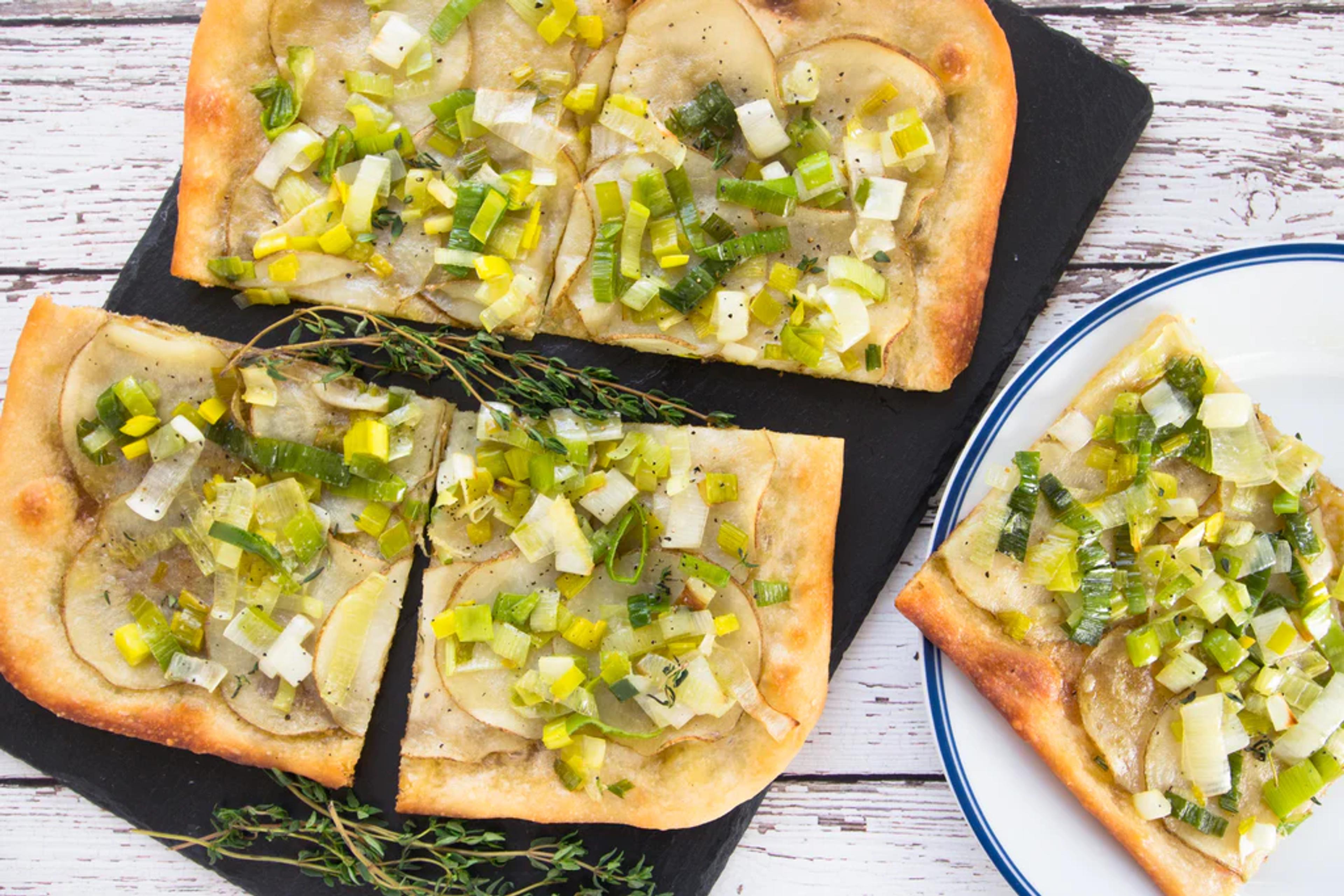 Using a mandoline or sharp chef’s knife cut potato into paper thin slices. Cut leek into thin rounds and rinse well under cold water. Coat a baking sheet or pizza pan with a thin layer of olive oil or a dusting of cornmeal. On a clean working surface dusted with flour, gently stretch the pizza dough to fit your pan, roughly a 10" x 6" rectangle. Gently place dough in the pan. Layer on potato slices in rows, overlapping and leaving a crust. Drizzle with olive oil and sprinkle with salt. Place in the oven and bake until crust beings to turn golden.