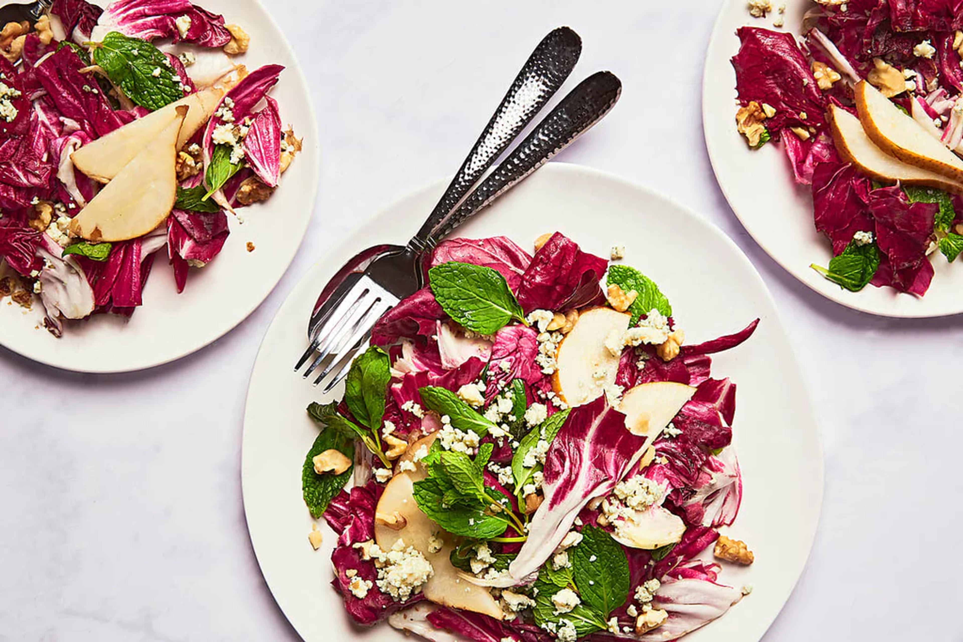 Tear radicchio leaves into bite-size pieces. Thinly slice pear. Simply arrange radicchio and pear on serving plate. Scatter with walnuts and crumbled blue cheese. Whisk together olive oil, lemon juice, garlic, and Dijon in small bowl, then pour over salad to serve.