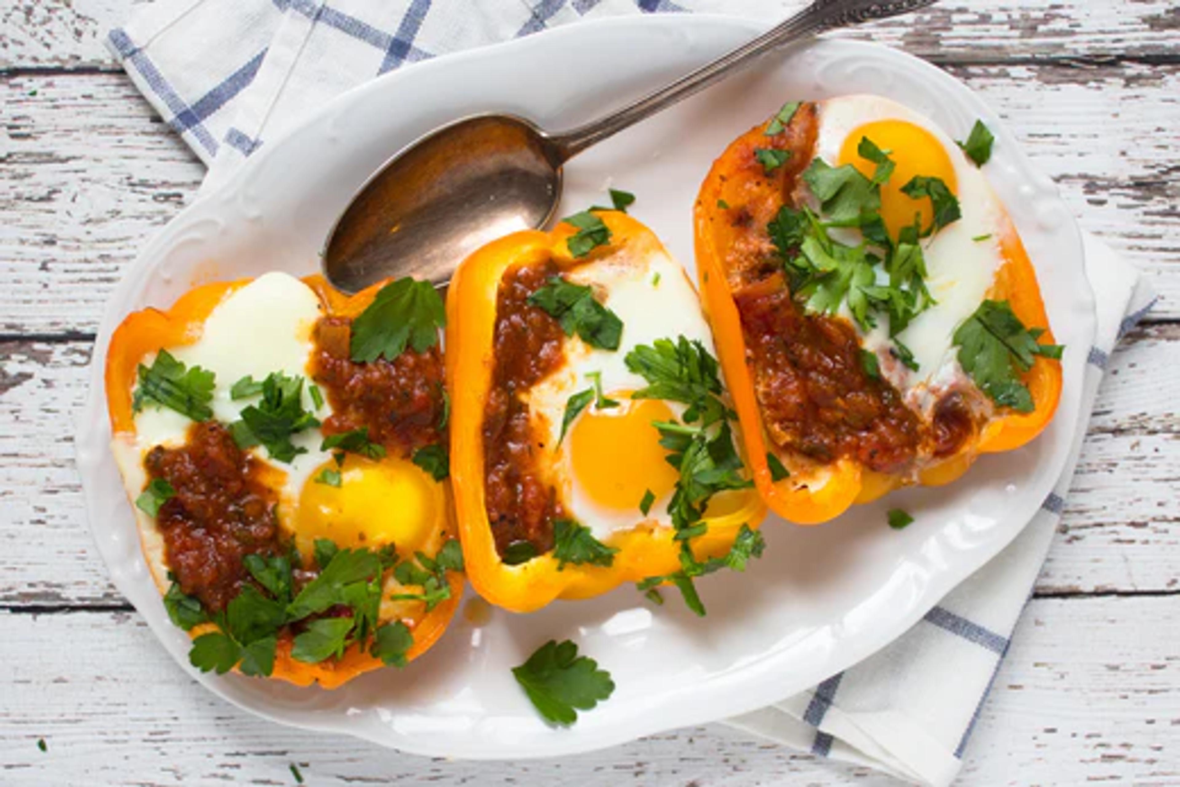 Preheat the oven to 375 degrees. Place the peppers on a baking sheet skin side down. If necessary, use a small tin foil nest to keep each piece upright and sturdy. Crack an egg into 1 half pepper and top with 2 Tbsp. Shakshuka and 1 Tbsp. cheese. Season with a pinch of salt and pepper. Repeat with the remaining peppers and eggs. Place in the oven for 15-20 minutes, until the yolk is set to your liking. Garnish with the parsley and divide between 2 plates.