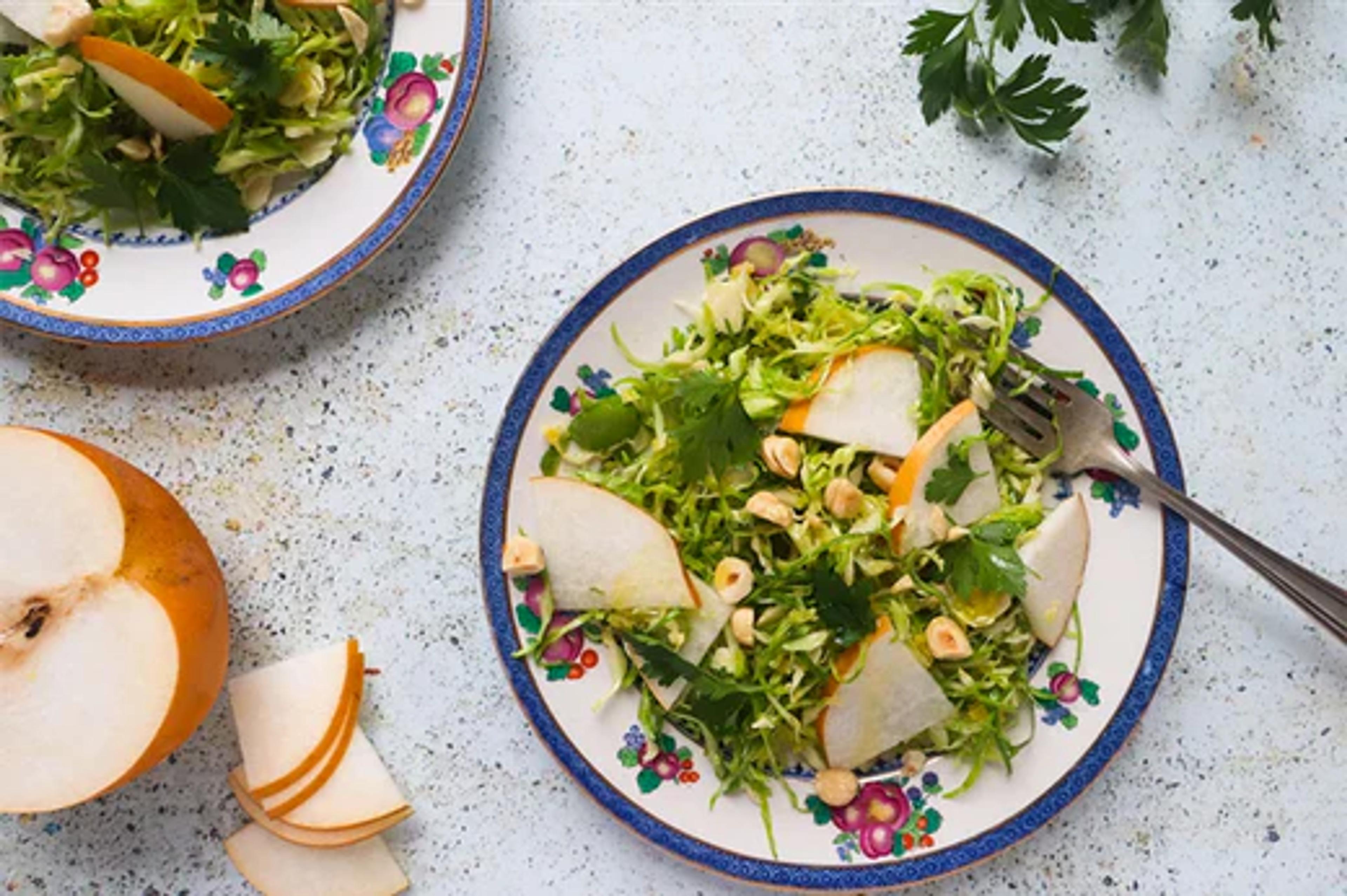 Using sharp knife or thinnest blade on a mandoline, slice cabbage very thinly. Slice Asian pear in same manner. Combine in large bowl.