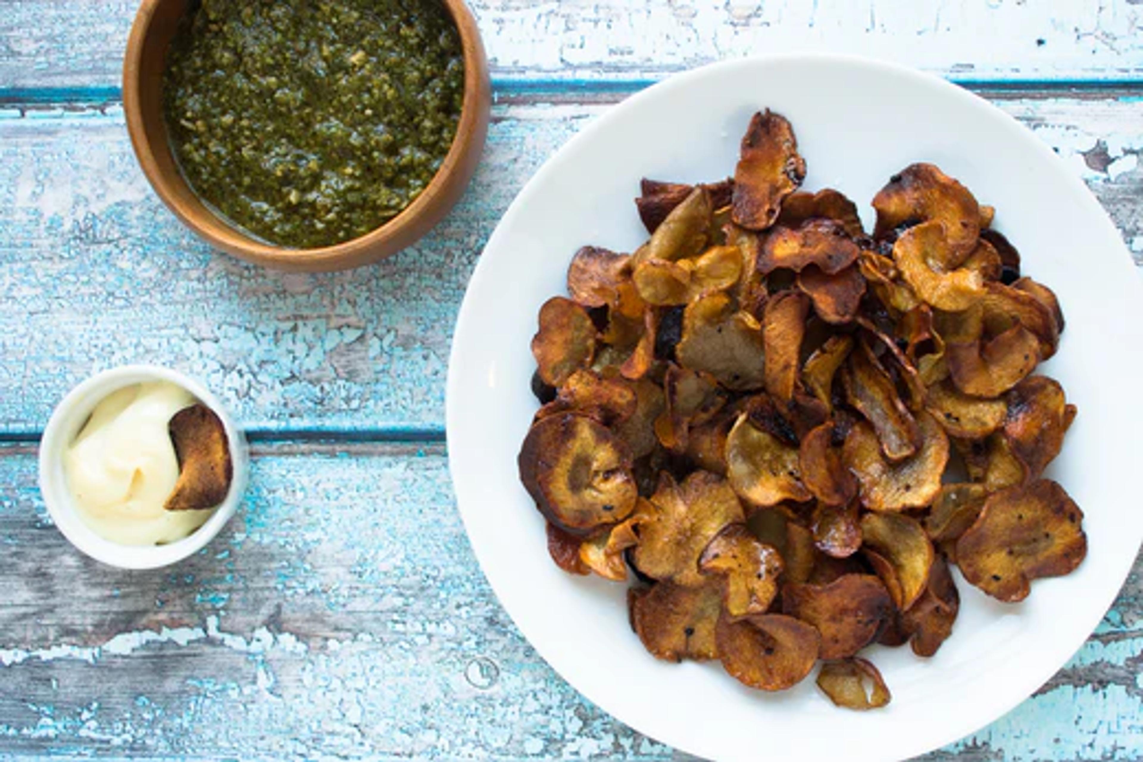 Preheat oven to 400 degrees. Place spinach, almonds, garlic and cheese (if using), in blender or food processor. Process on low while slowly drizzling in 4 Tbsp oil. Season with lemon juice and pinch sea salt and pepper; set aside. In small bowl, toss sunchokes along with remaining oil and pinch sea salt. Spread evenly in single layer on lightly oiled baking sheet. Bake 15-25 minutes until dried and golden brown, turning once. Serve in bowl alongside spinach pesto.