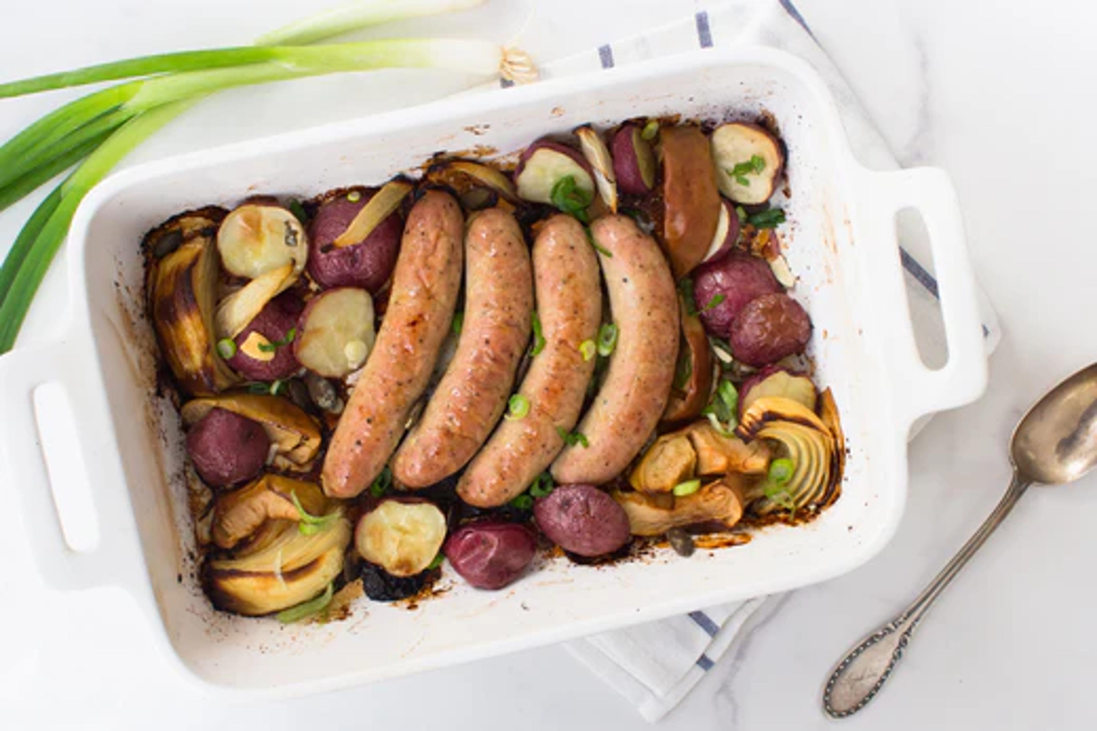 Preheat your oven to 375 degrees Fahrenheit. Cut apples, kohlrabi, onions, and fingerling potatoes into 1-2 inch pieces. Combine apples, potatoes, and onion in large mixing bowl and toss with olive oil, salt, pepper, and chopped rosemary. Pour mixture into a roasting pan, and roast in oven for 35 minutes, using a spatula to turn after 15 minutes. Place sausages in the roasting pan on top of the potatoes and apples, and roast for another 5 minutes, until slightly browned. Serve with a side of mustard.
